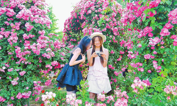 漫步寻芳 庾园月季园迎来盛花期近日,坐落于大观公园庾园内的月季园,迎来一年中最绚烂的时节,13000平方米的园中,206个品种的月季竞相绽放,繁花似锦。